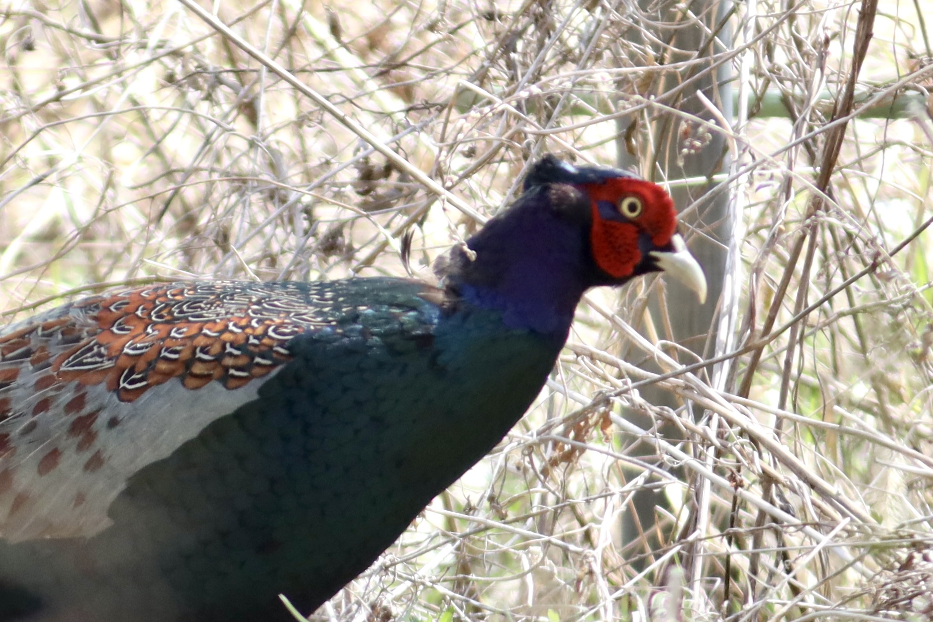 調べてみると、外来種のコウライキジというのに似ています。でも、コウライキジの特徴であるノドの白いリングがありません。