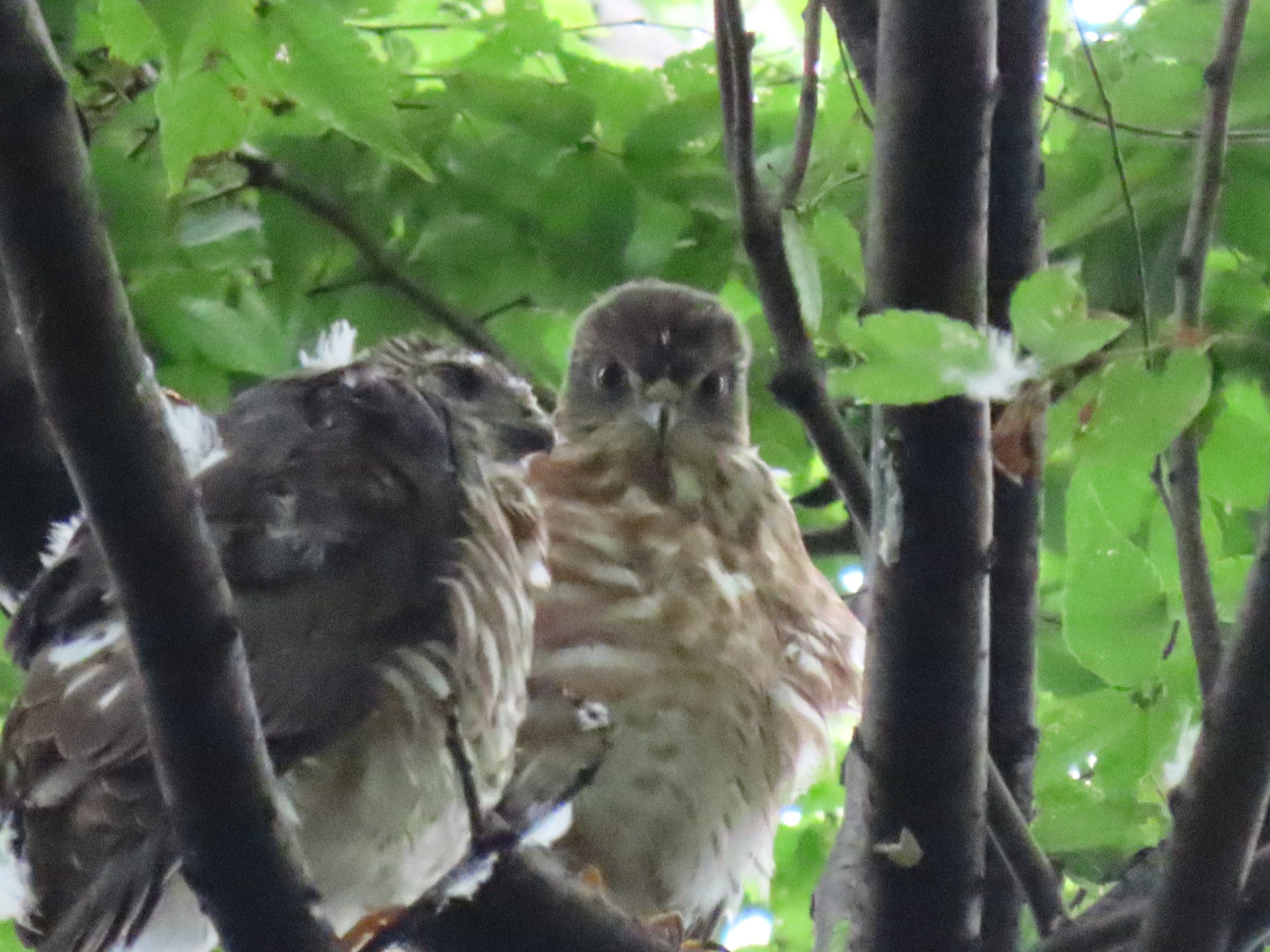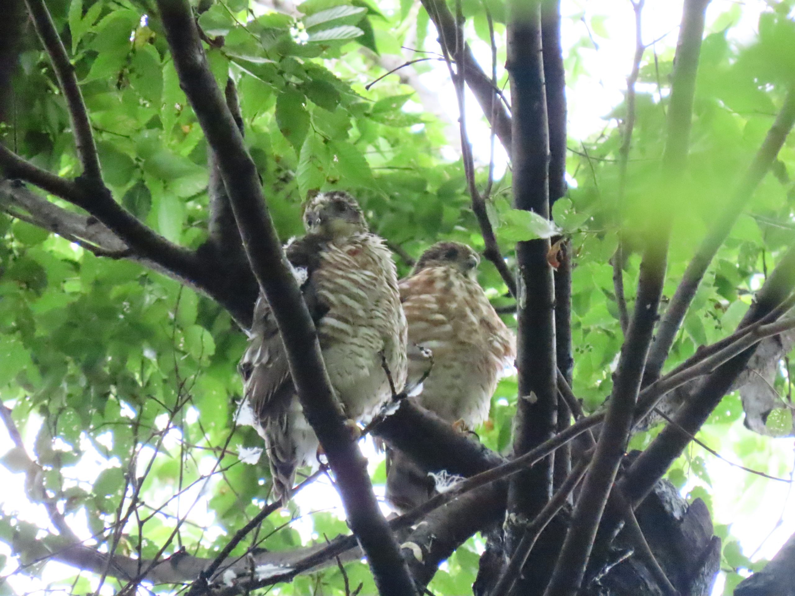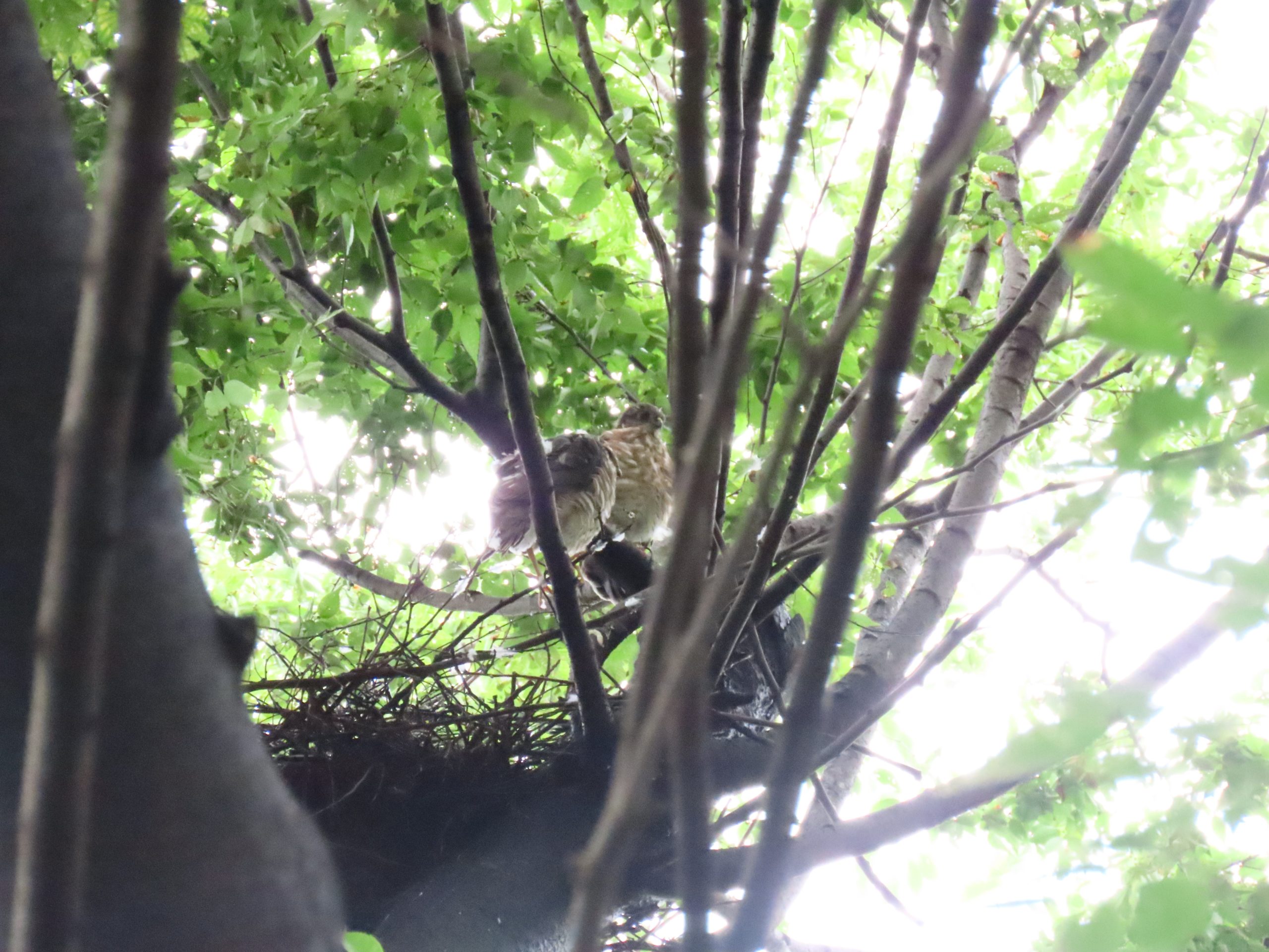 久しぶりに見にいくと、親が飛び去った後に、巣の上のあたりの枝に雛が出ていました。