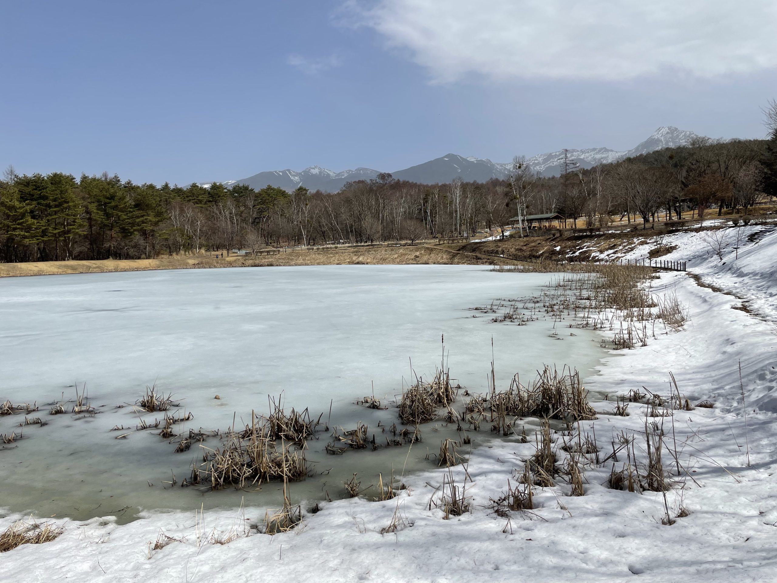 コガモやカイツブリがいるかな?と思い長野県原村の八ヶ岳自然文化園にあるまるやち湖を訪ねてみると、八ヶ岳の北麓はまだ雪が残っていて、湖面は真っ白。野鳥の姿はありませんでした。